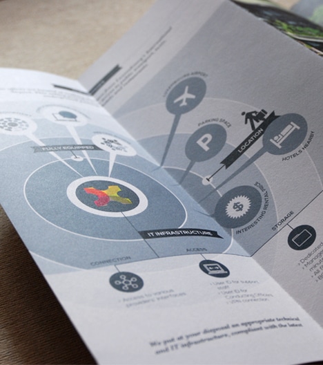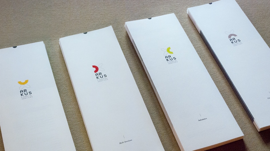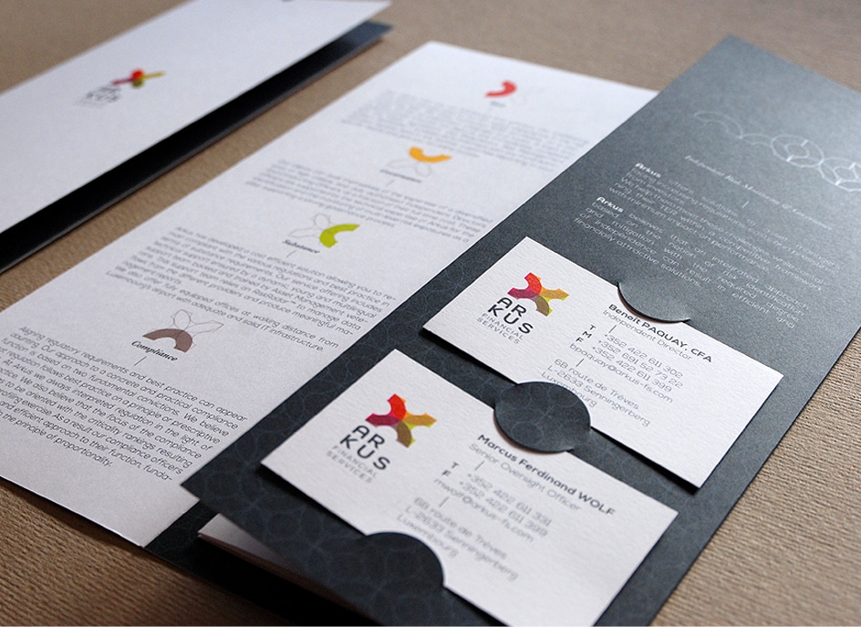 Le façonnage de la farde : des encoches en demi-cercle rappellent les formes du logo tout en permettant à Arkus d’y glisser des cartes de visite !