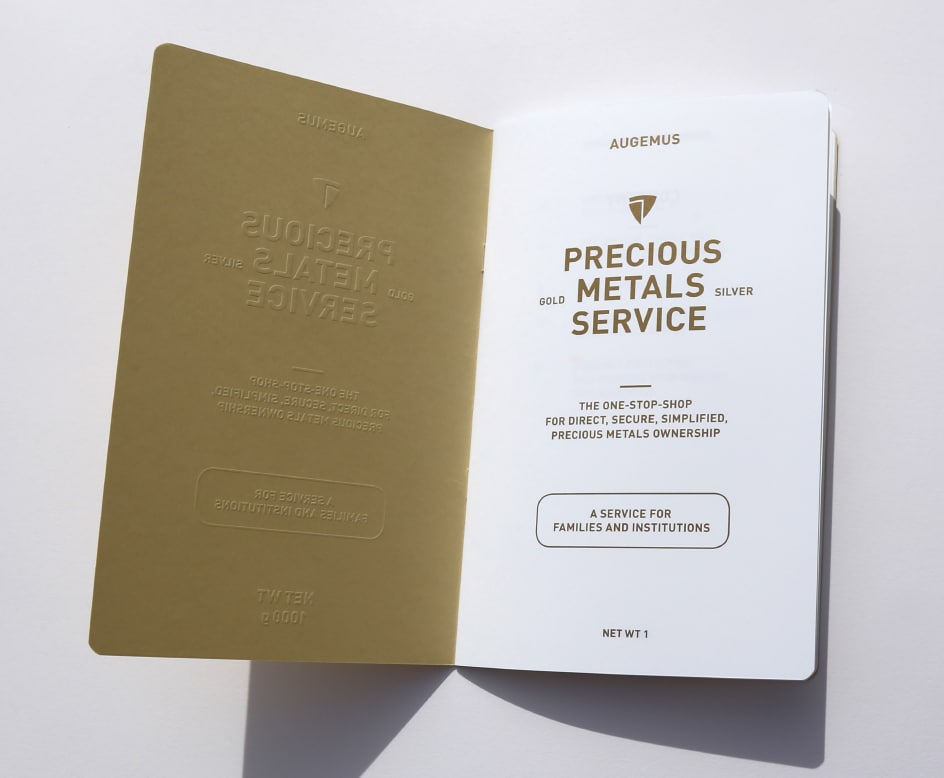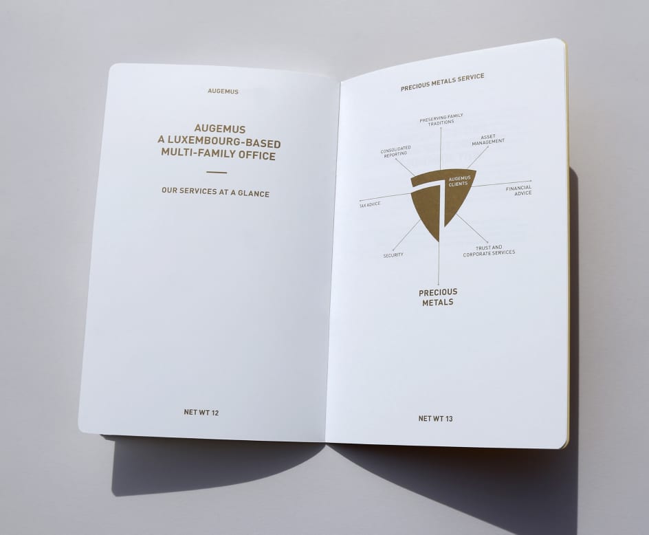 La brochure réalisée pour présenter ce service a été pensée comme un lingot d’or. Elle véhicule dès le premier coup d’œil l’imagerie liée à ce métal précieux, l’exclusivité et le luxe.