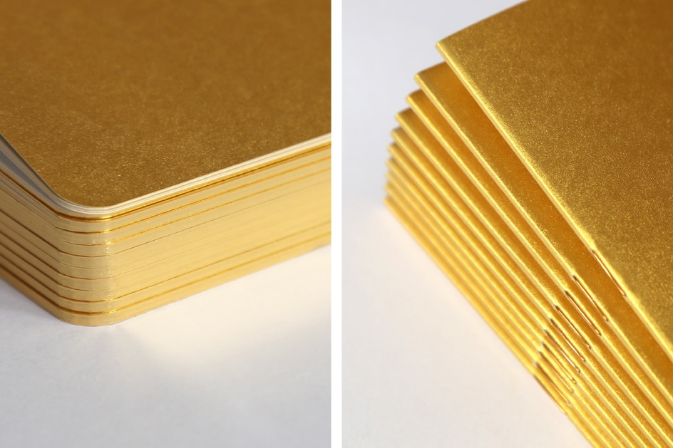 Ses finitions la rendent singulière et unique : utilisation d’un papier brillant (Gmund Value Gold), agrafes dorées, pantone metal, gaufrage de la couverture, dorure à chaud, coins arrondis.