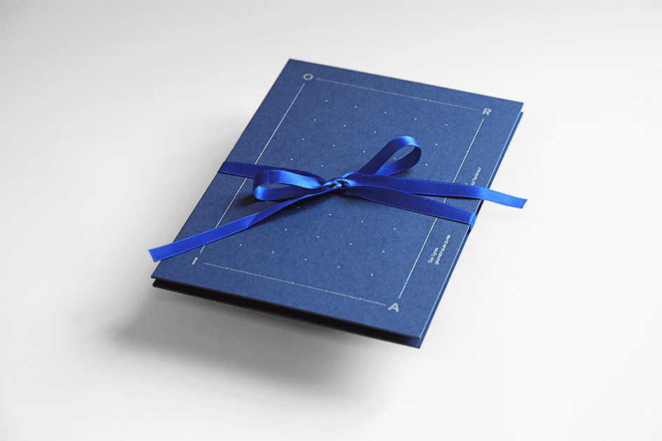 Pensé comme un écrin, fermé par un ruban bleu, les couvertures imprimées en letterpress et Pantone argent se déploient une fois le ruban dénoué en accordéon ou en lecture page à page.