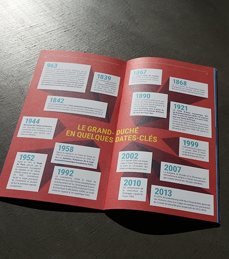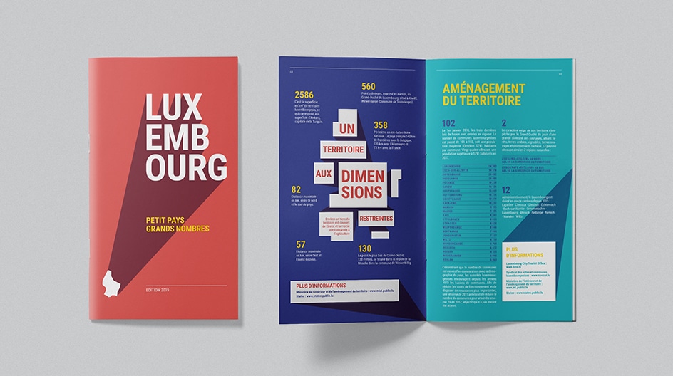 Le graphisme de la brochure « Petit pays grands nombres », principalement destinée aux lycéens, se base sur des couleurs fortes et dynamiques, ains que sur un jeu de typographies avec effet d’agrandissement. Les couleurs utilisées en aplat scandent les chapitres et renforcent l’impact du contenu.