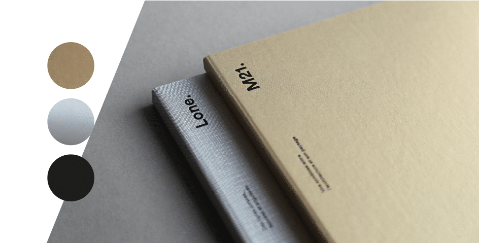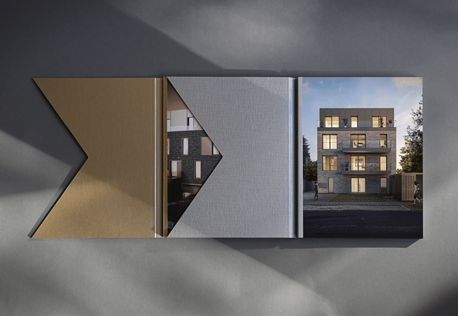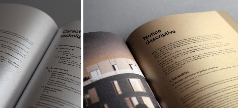 La découpe de la couverture signe l’identité du promoteur de façon luxueuse et discrète, et le papier choisi rappelle les tonalités des résidences, argent pour Lone, or pour M21, ainsi que leurs finitions texturées.