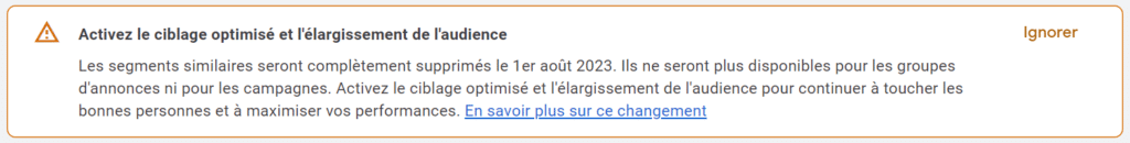 Notification Google Ads indiquant la suppression des segments similaires le 1er août 2023 et recommandant d’activer le ciblage optimisé et l’élargissement d’audience.