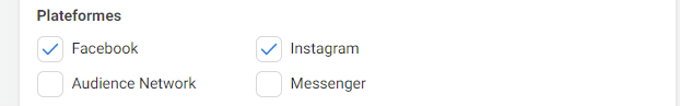 Interface Google Ads affichant les options de plateformes : Facebook, Instagram, Audience Network et Messenger.