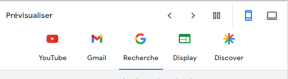 Interface Google Ads affichant les options de diffusion : YouTube, Gmail, Recherche, Display, Discover.