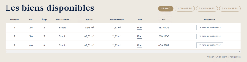 Pour notre client Capelli et son projet South Village, nous avons utilisé une page regroupant tous les bien disponibles avec des appels à action “ce bien m’intéresse”.