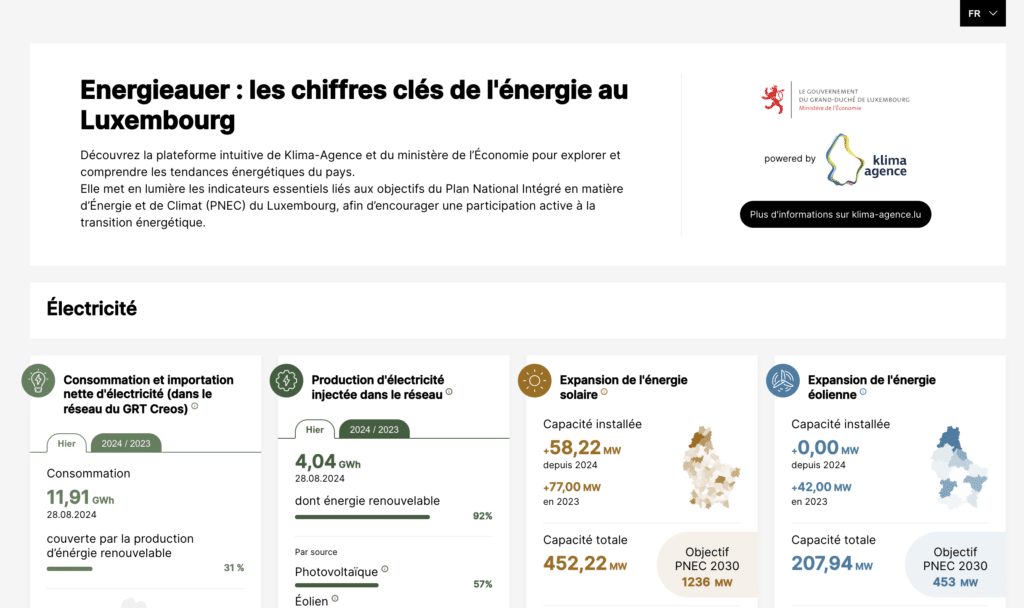 Capture d'écran du site Énergieauer présentant les chiffres clés de l'énergie au Luxembourg, avec des statistiques sur la consommation d'électricité, la production d'énergie injectée dans le réseau, et l'expansion des énergies solaire et éolienne.
