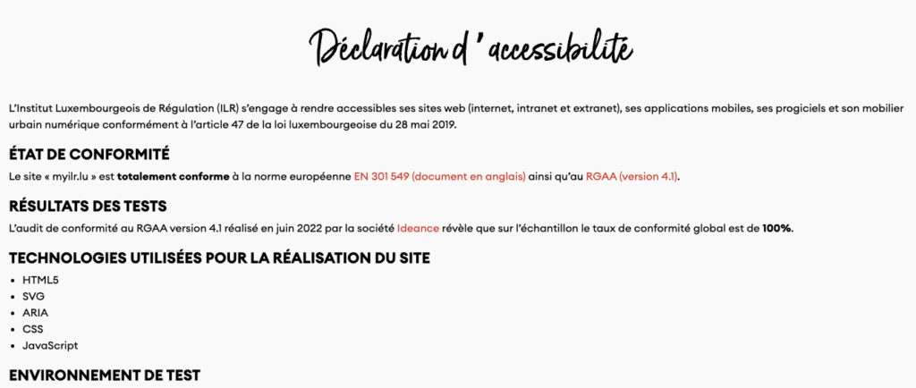 Déclaration d'accessibilité de l'Institut Luxembourgeois de Régulation (ILR). Le site myilr.lu est conforme aux normes EN 301 549 et RGAA 4.1. Audit de juin 2022 par Ideance révèle 100% de conformité. Technologies utilisées : HTML5, SVG, ARIA, CSS, JavaScript."