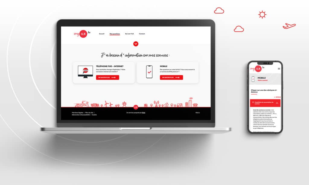 Une capture d'écran du site web "myILR.lu" affichée sur un ordinateur portable et un smartphone. Sur l'écran de l'ordinateur portable, la page d'accueil propose des informations sur les services de télécommunications avec deux options principales : "Téléphone fixe - Internet" et "Mobile". Chaque option est accompagnée d'un bouton "En savoir plus".