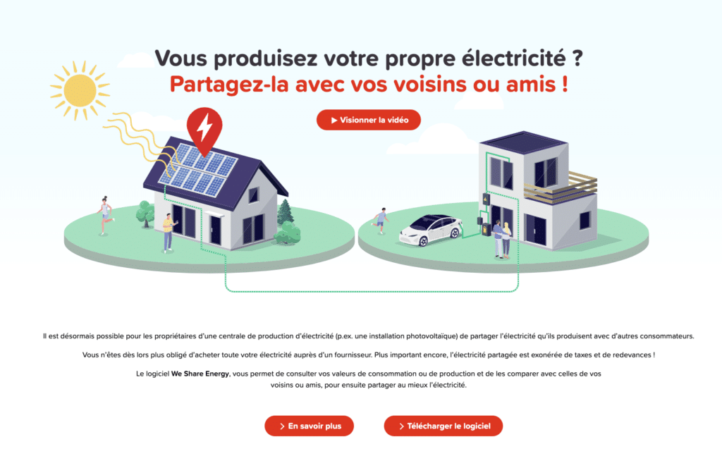 Une illustration montrant deux maisons et des personnes utilisant de l'électricité produite par des panneaux solaires. La maison de gauche est équipée de panneaux solaires sur le toit, produisant de l'électricité qui est partagée avec une autre maison à droite. Un câble vert relie les deux maisons pour symboliser le partage d'électricité. En haut de l'image, le texte "Vous produisez votre propre électricité ? Partagez-la avec vos voisins ou amis !" est affiché en gros caractères, avec un bouton "Visionner la vidéo" en dessous.