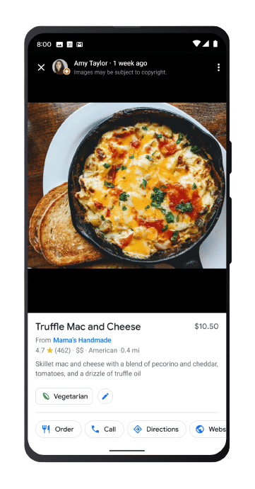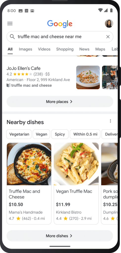 Le Search On a aussi prêté attention aux recherches relatives aux repas. Bientôt il sera possible d’accéder directement aux restaurants proposant les plats recherchés.