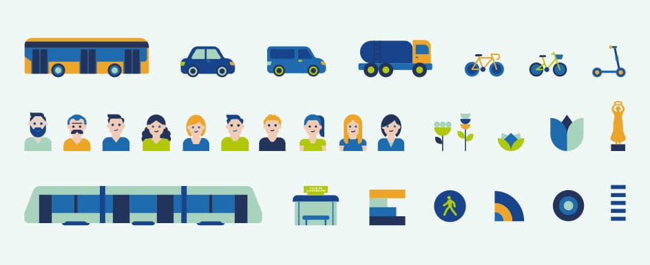 Cette mission s’articulant autour de 4 moments clés, nous avons réalisé un univers graphique riche et hyper flexible composé d’éléments illustratifs autour du thème de la mobilité.