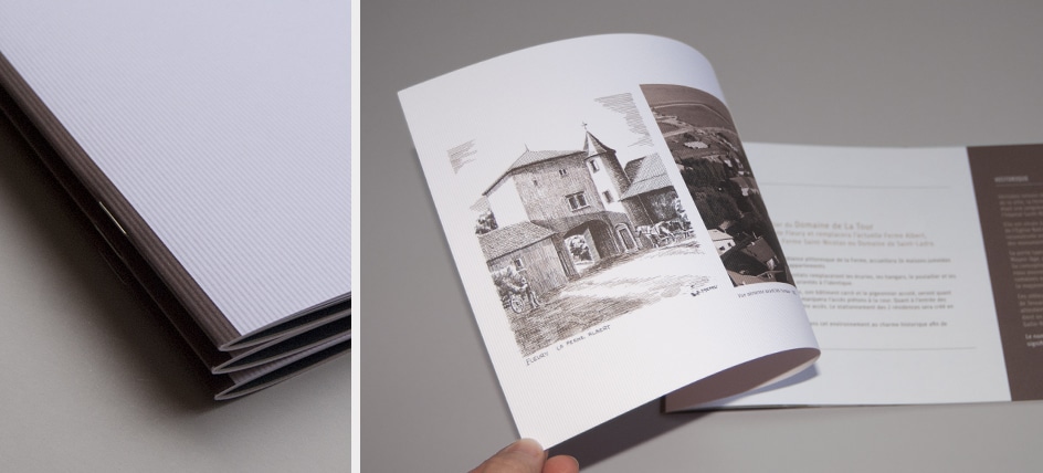 La brochure commerciale a été créée dans le même esprit en alliant des éléments graphiques actuels (typo ronde, parfois manuscrite, etc.) et d’autres soulignant le passé historique du lieu (trame, pictogrammes, couleurs, etc.). Son design s’efface pour laisser place à de grandes vues 3D mettant le projet en valeur. Les chiffres, visibles sur les différentes fiches des appartements, font le lien avec le bardage en bois composé de lignes verticales des façades des futurs bâtiments. Ce clin d’œil a pris une dimension plus large lors du choix du papier lui-même. Le papier choisi pour la couverture est plus épais que celui des pages internes. Il se distingue par un pressage en lignes tranchant, sur ses deux faces.