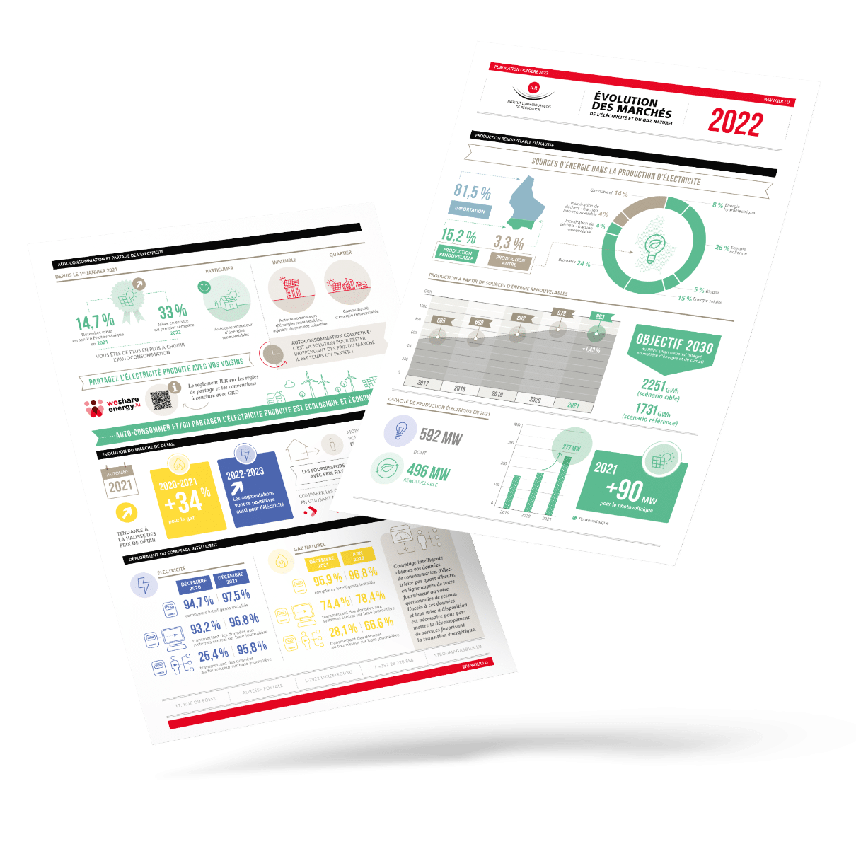 Notre expertise en matière de communication et de traitement de l’information nous ont permis de mettre en place des solutions innovantes. Un des rôles de l’ILR est de produire des rapports sur le marché des télécommunications ou de l’énergie au Grand-Duché. Etant donné qu’il s’agit souvent de rapports complexes et au contenu dense, nous avons décidé de travailler ces rapports sous forme d’infographie afin de rendre ces informations plus attractives et surtout accessibles pour un lecteur non averti.
