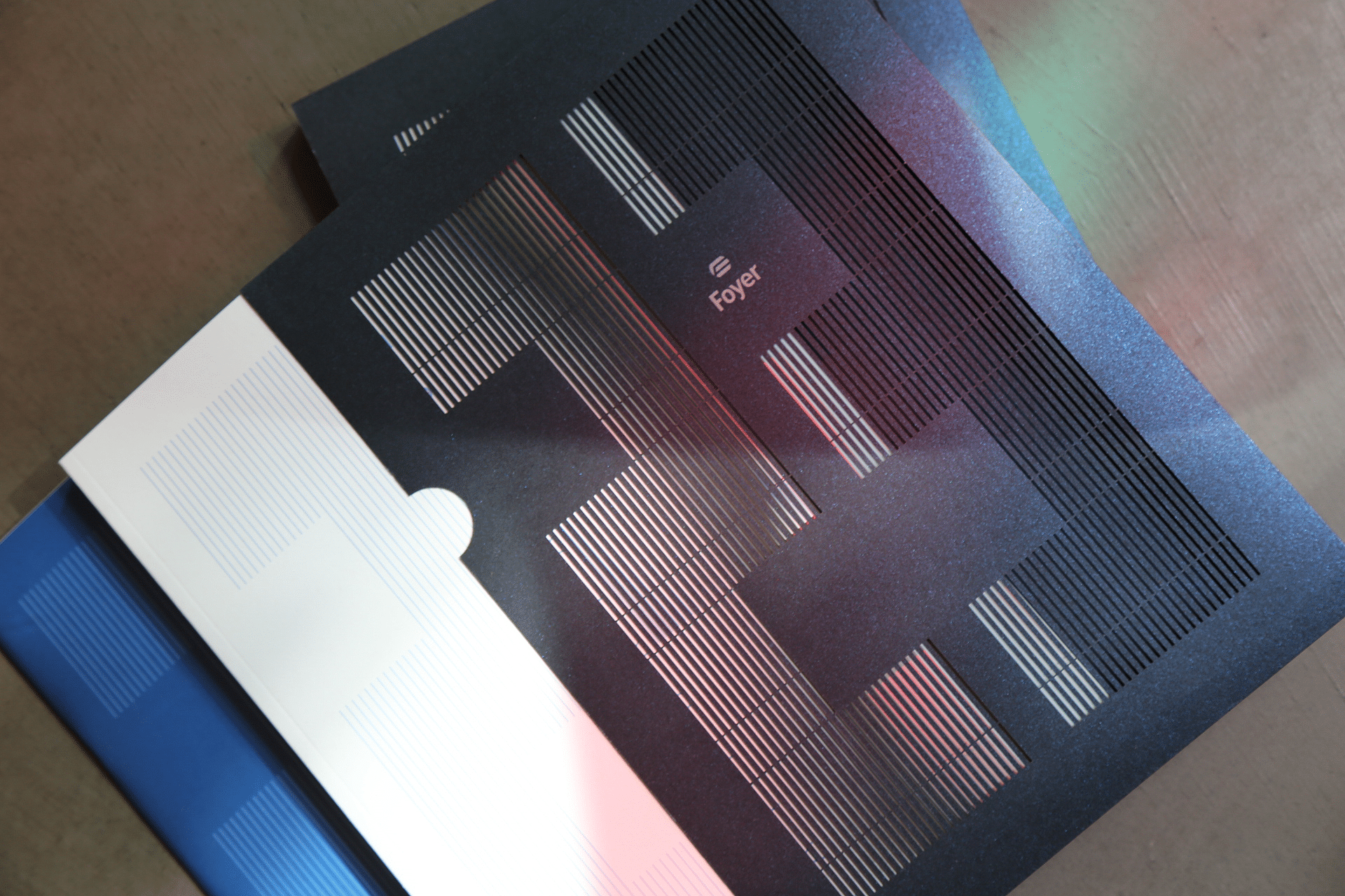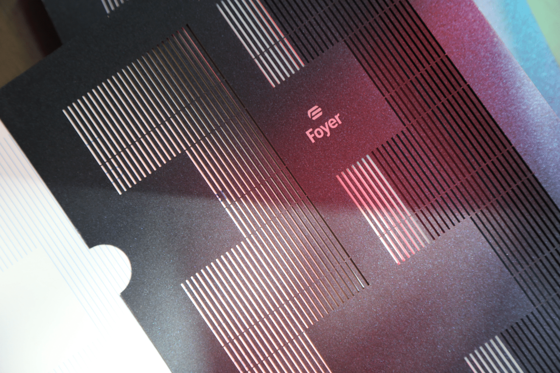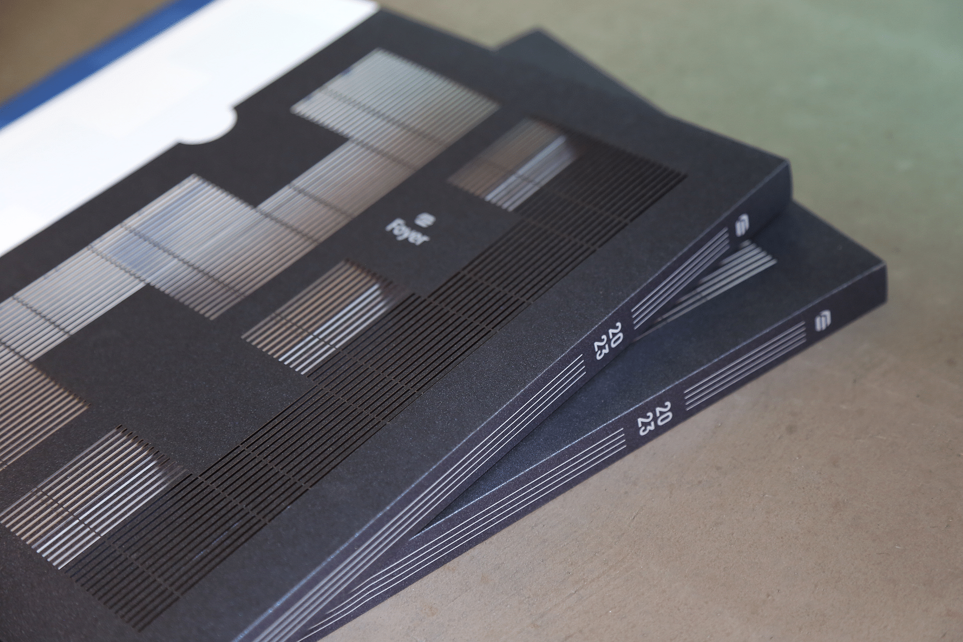 Gros plan sur la couverture du rapport annuel, on peut voir les détails des traits de découpe qui forment le nombre 23 et un jeu de lumière du soleil.