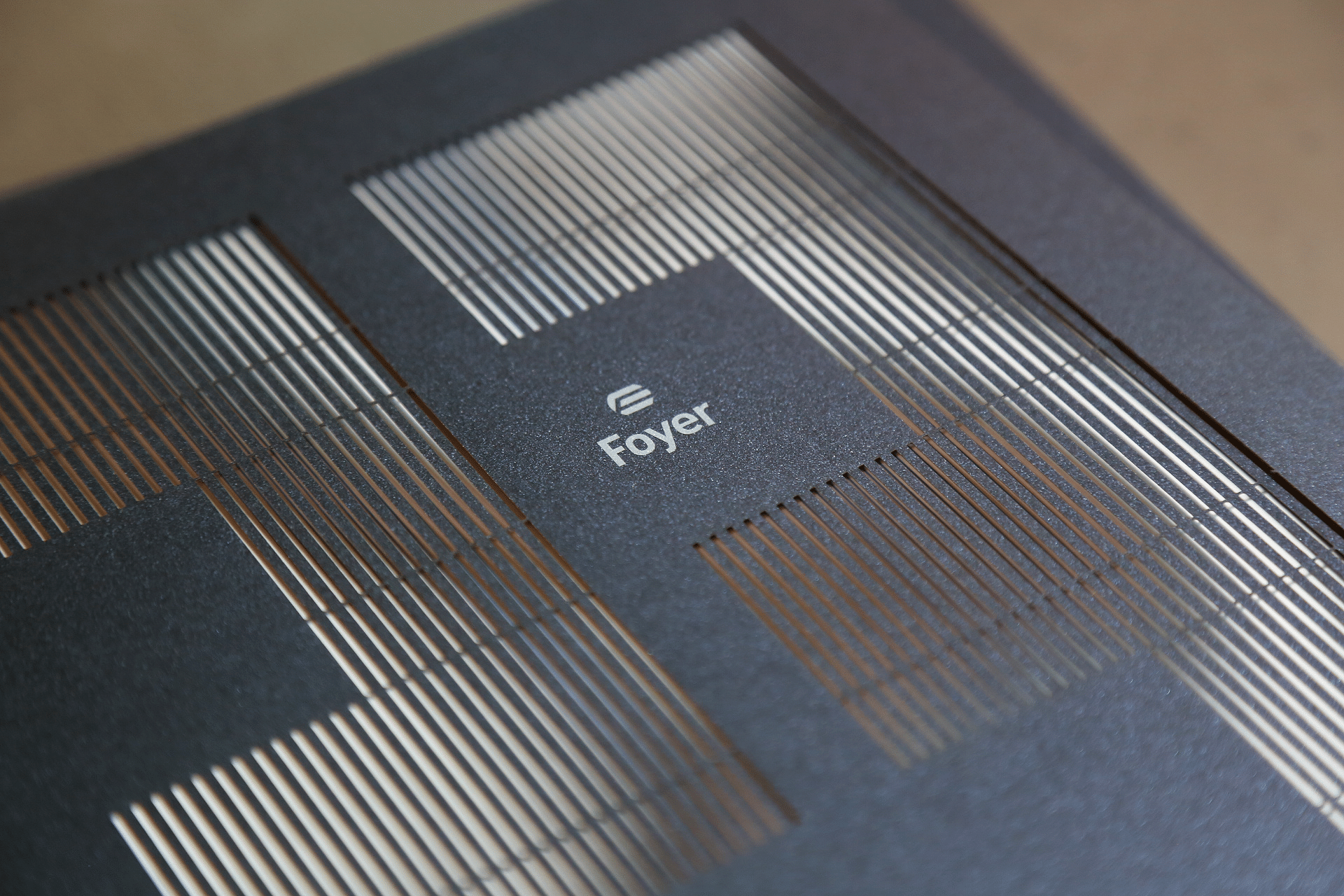 Détail d'une couverture de rapport annuel avec un design graphique complexe et un effet de lumière du soleil, incluant le logo de Foyer en blanc.
