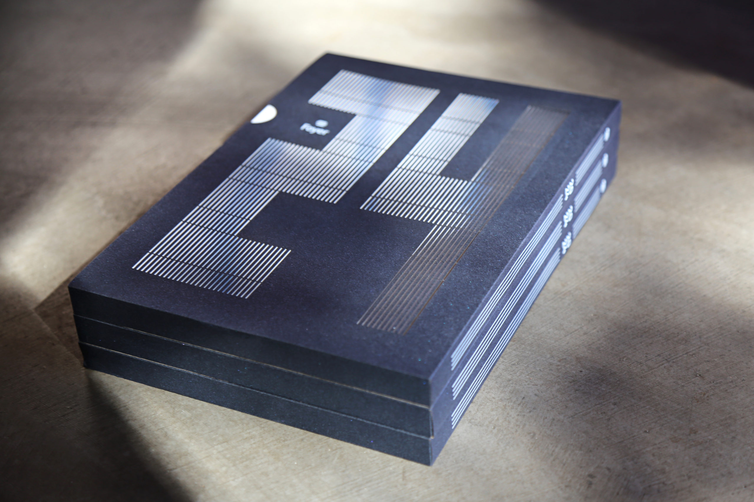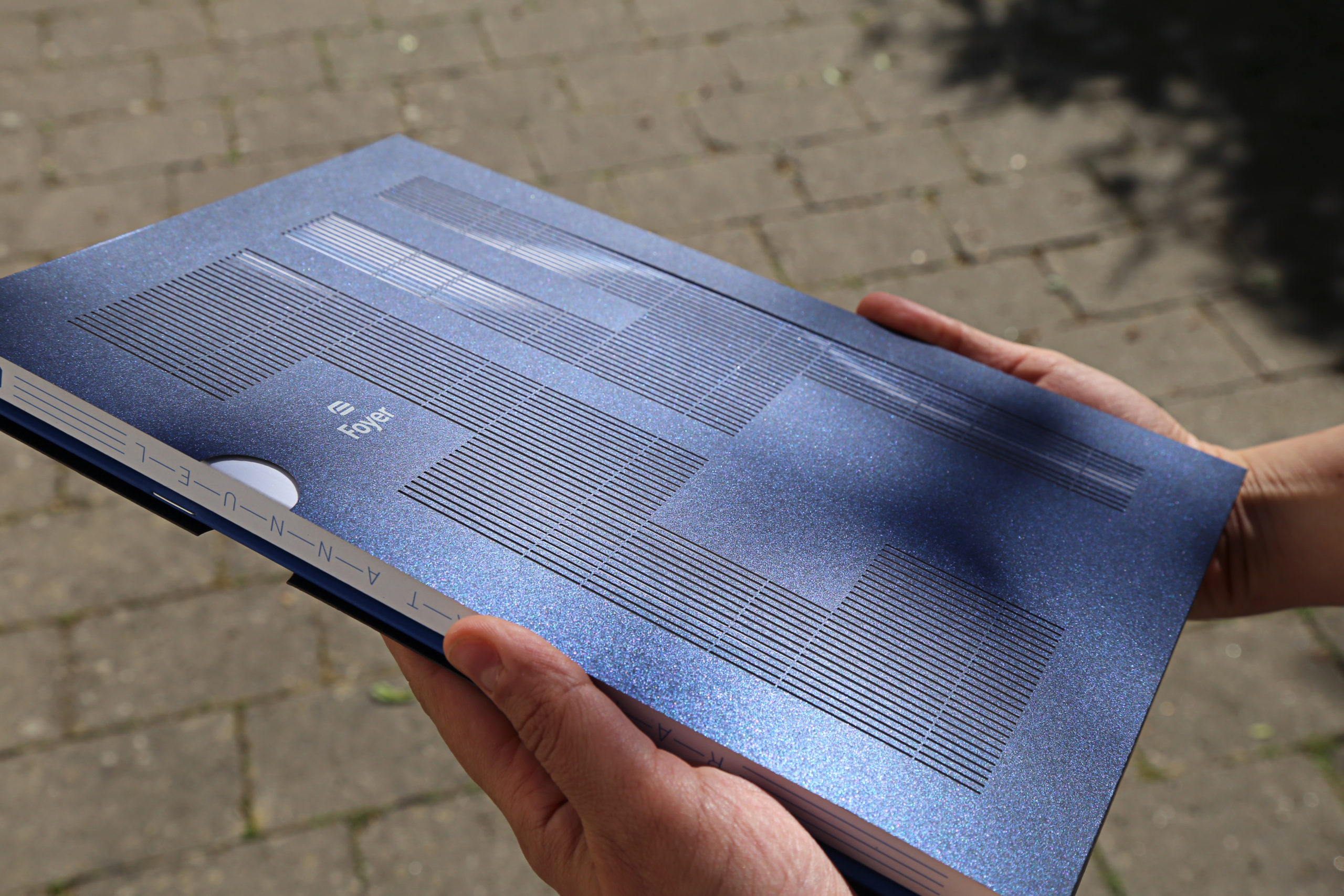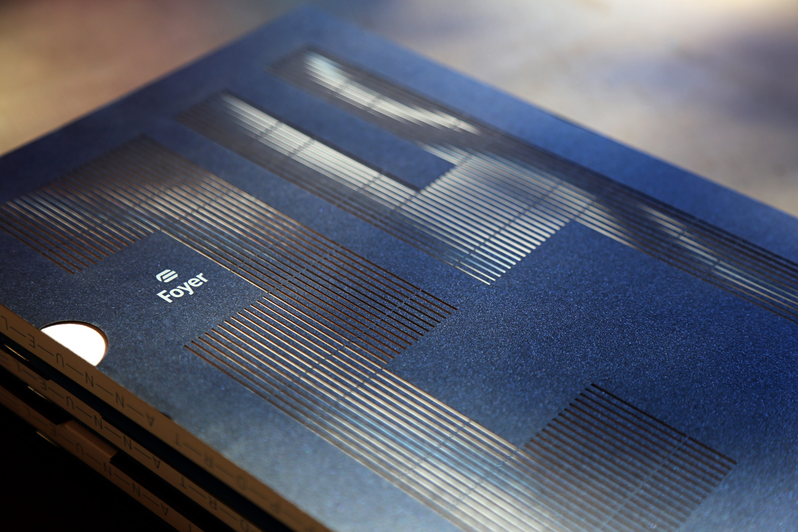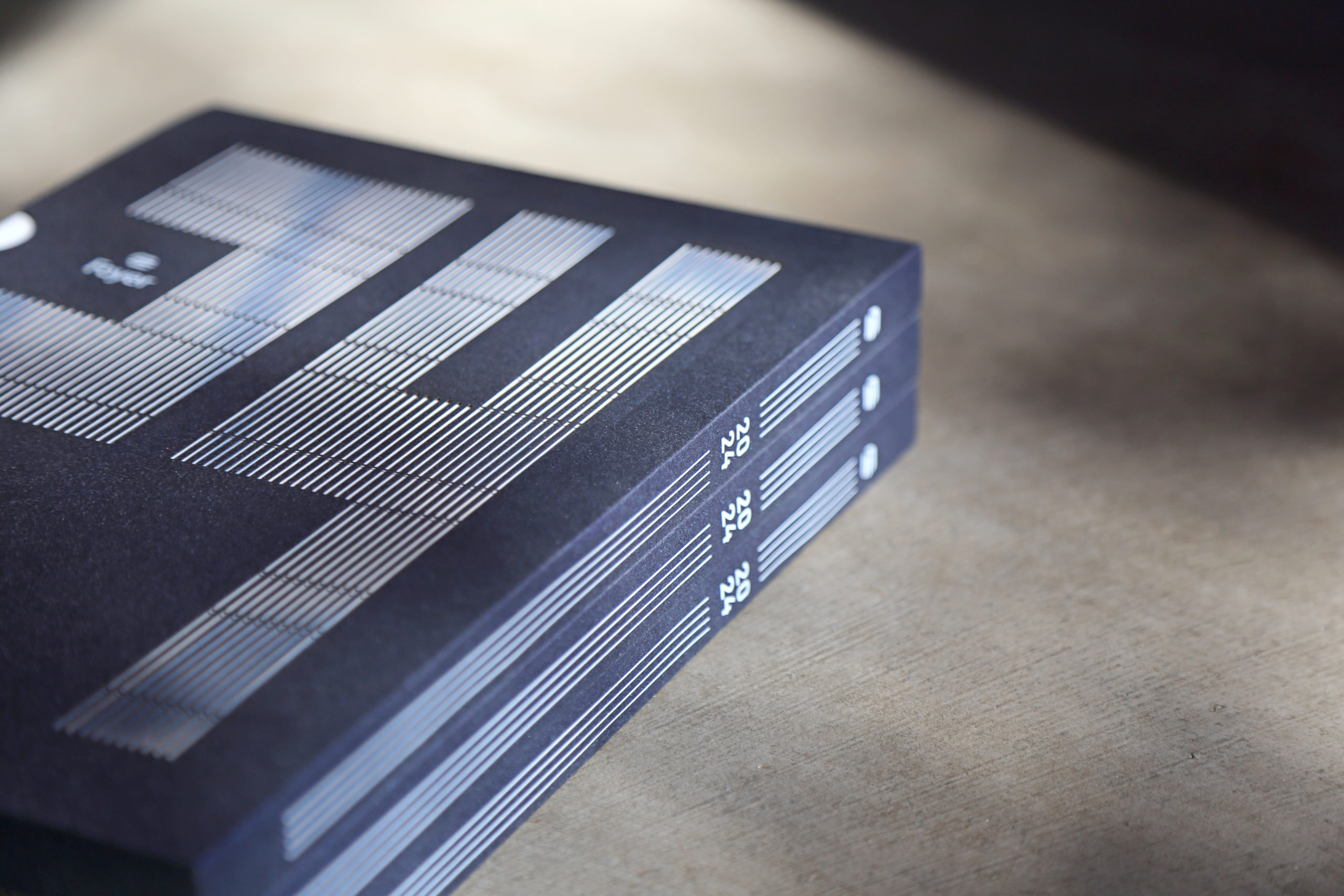 Rapport annuel Foyer 2024 au design bleu foncé avec des lignes en relief posé au sol