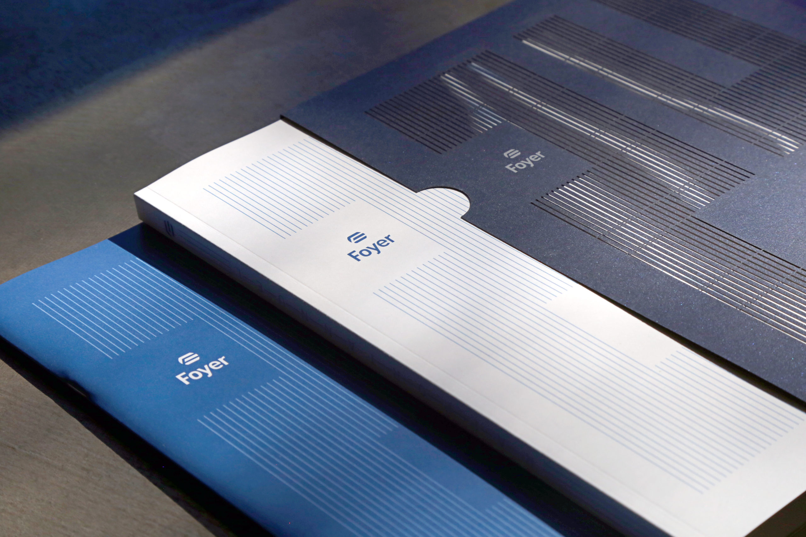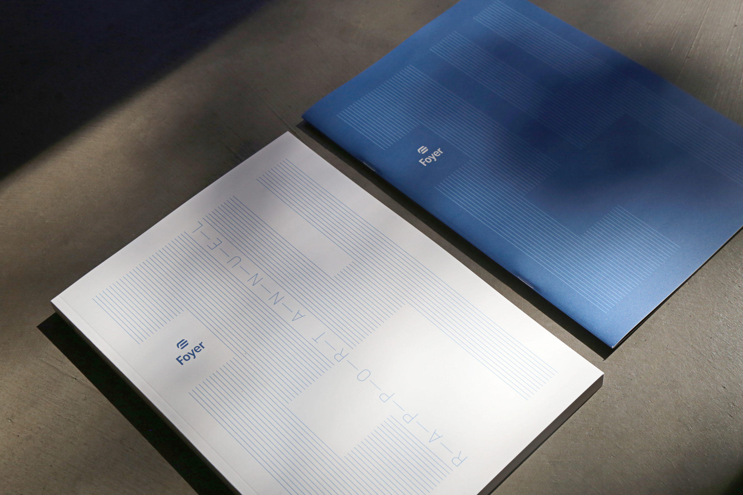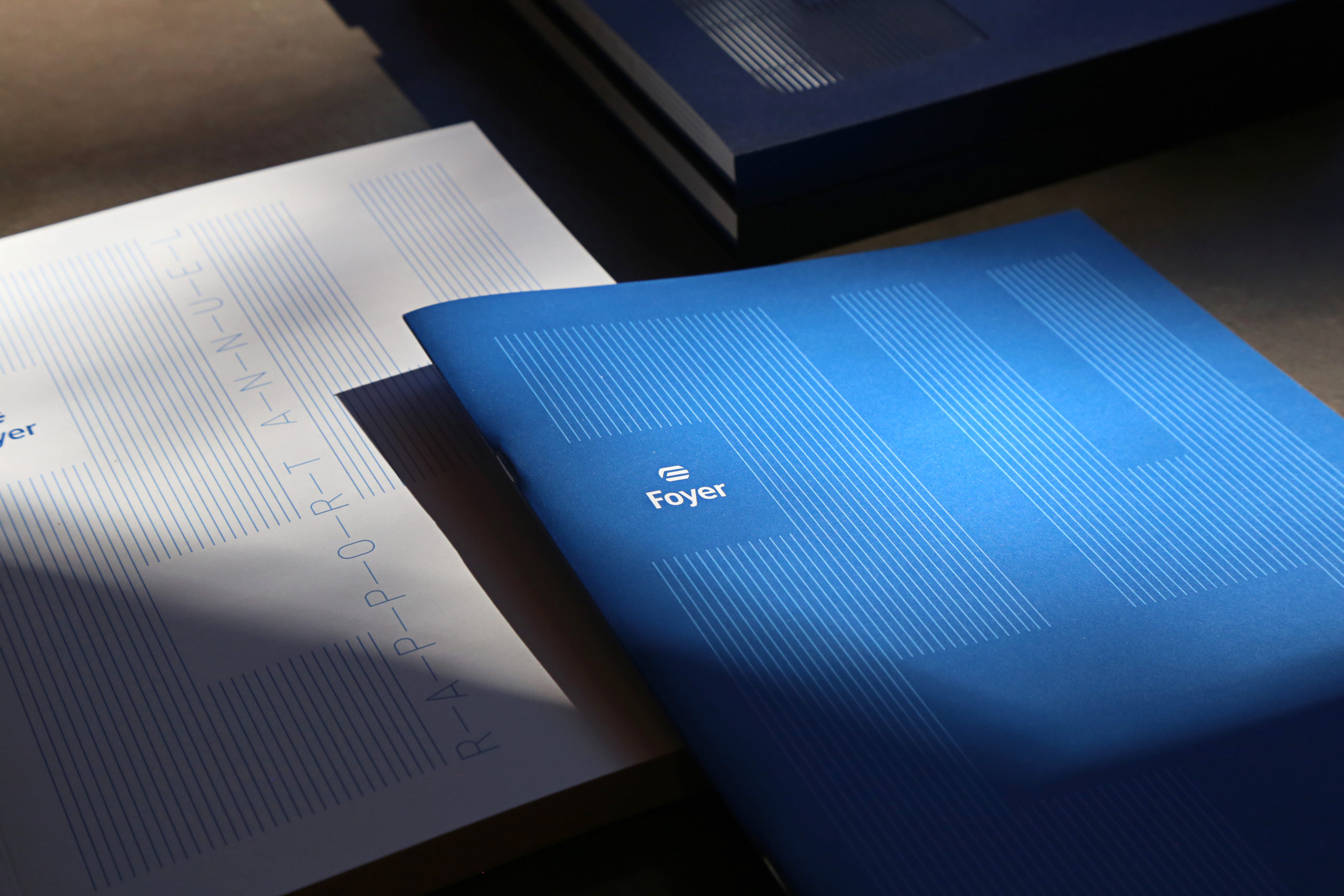 Deux rapports annuels de l'entreprise Foyer posés sur une table, avec un design épuré
