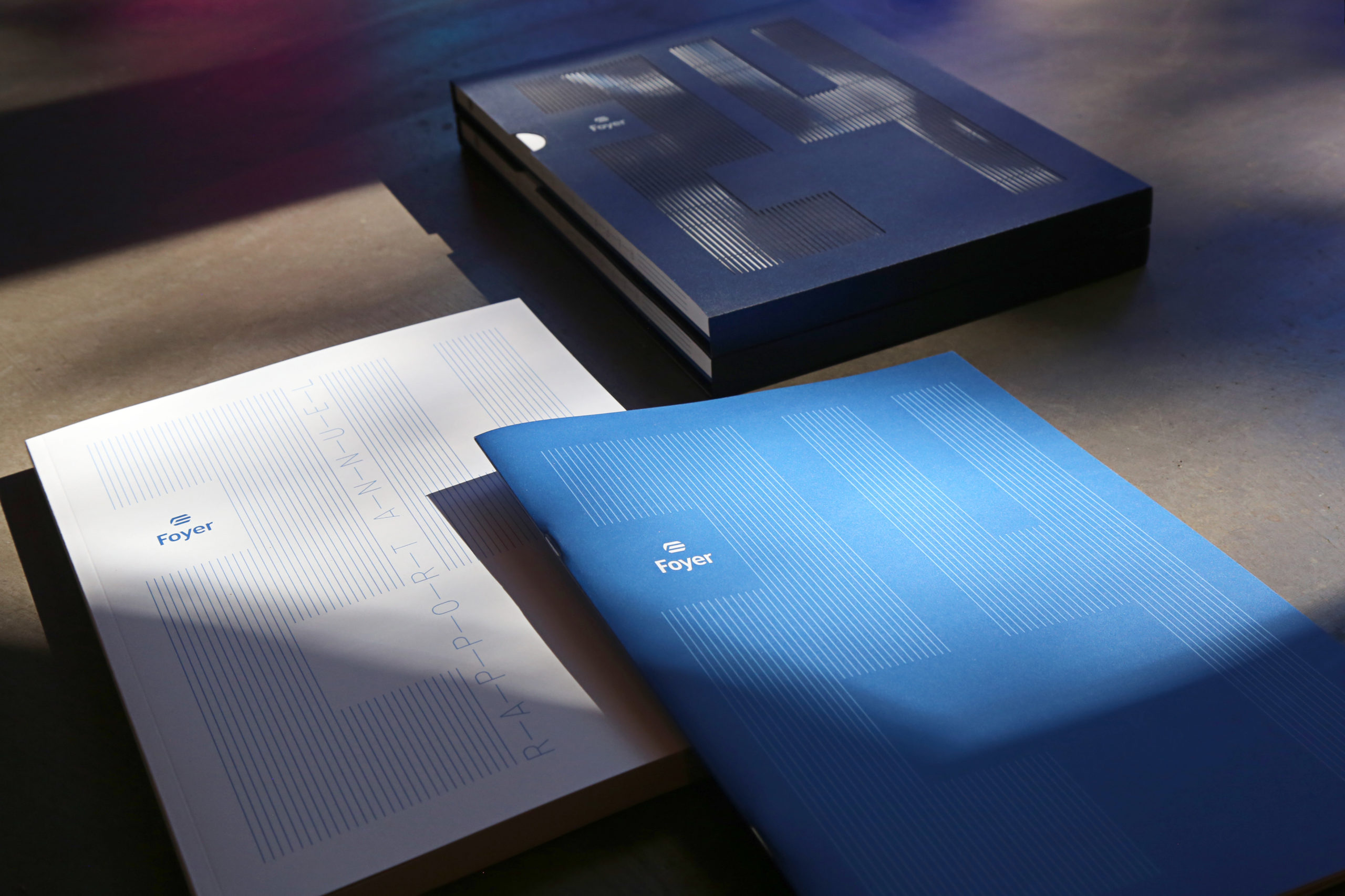 Trois rapports annuels de l'entreprise Foyer posés sur une table, avec un design épuré