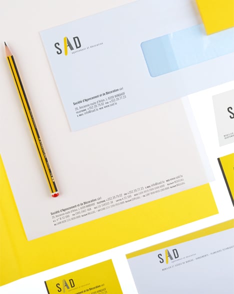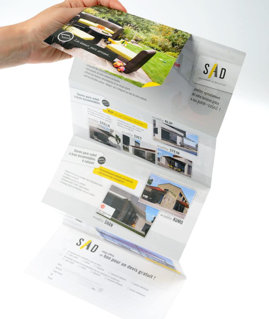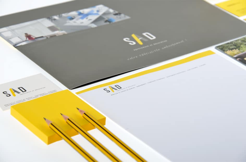 Pour rajeunir son image, l’identité visuelle de SAD a été retravaillée. L’objectif était de moderniser l’ancien logo. Pas de changement de couleurs, mais un travail sur les formes et la typographie. Cette évolution se retrouve sur l’ensemble du corporate : cartes de visite, enveloppes, entêtes de lettre, vitrines, etc. L’avantage ? Assurer une continuité dans l’esprit des clients.