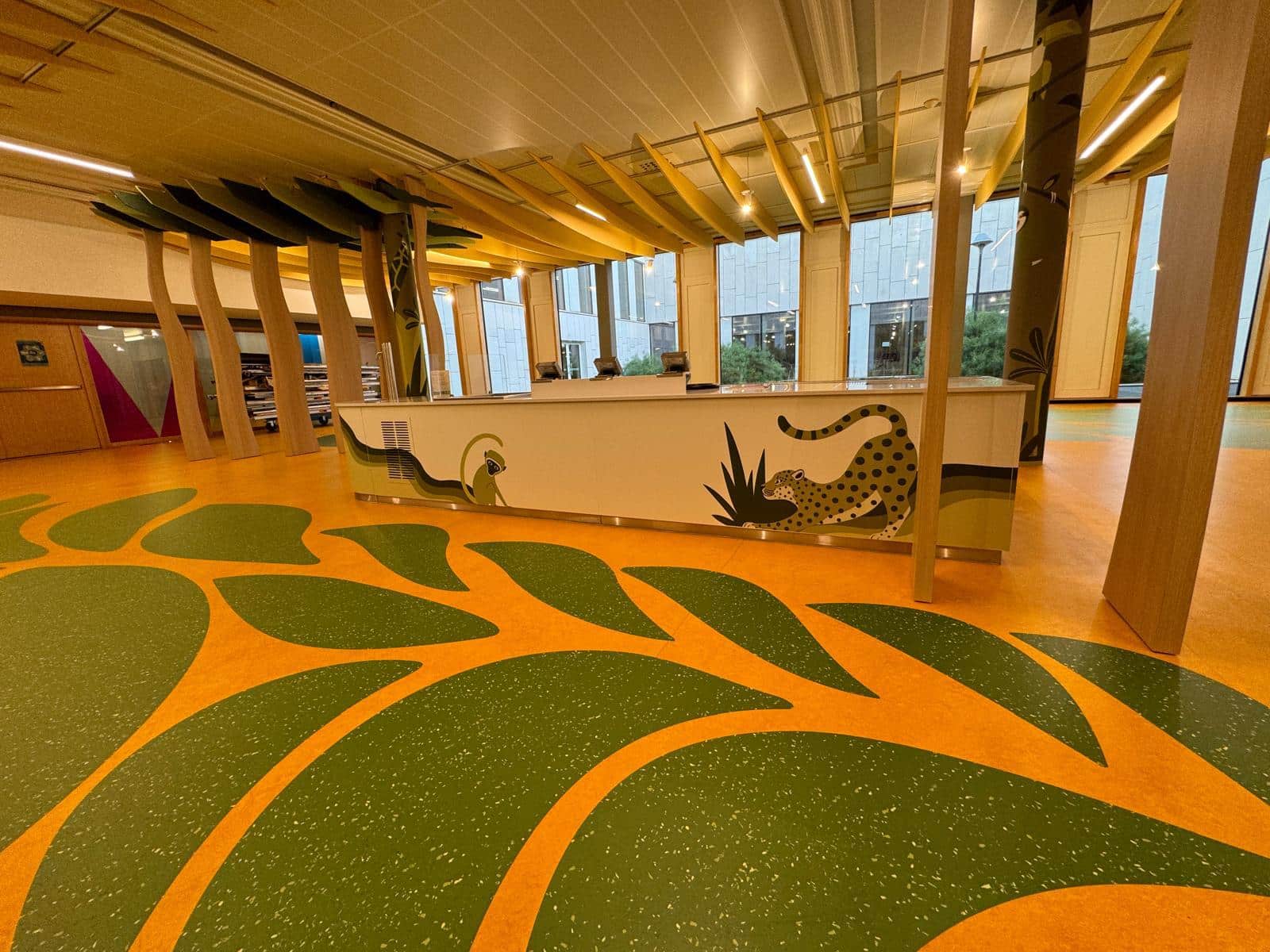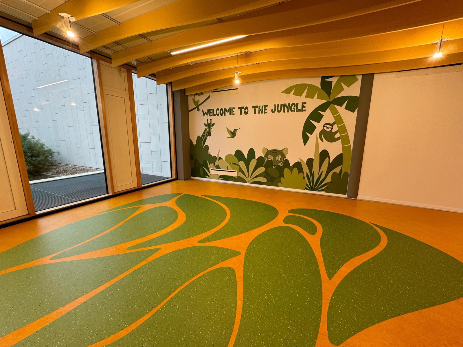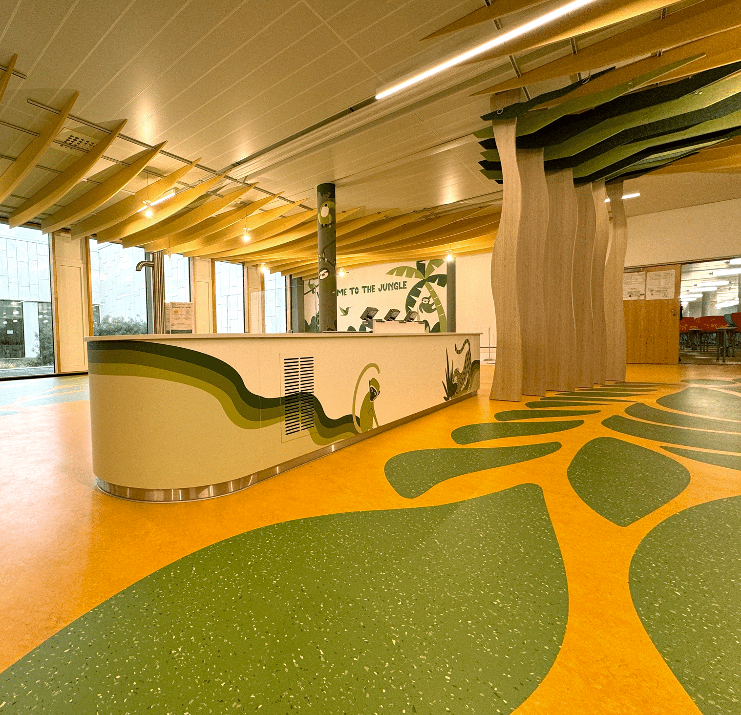 Les réalisations incluent : mur végétal et ardoise pour communication, arbre rétroéclairé de 3m avec assiettes suspendues, mobile d’oiseaux, et habillage des comptoirs. Pour les zones primaires, un sol végétal de 150m² avec thème nature-jungle et divers éléments décoratifs.