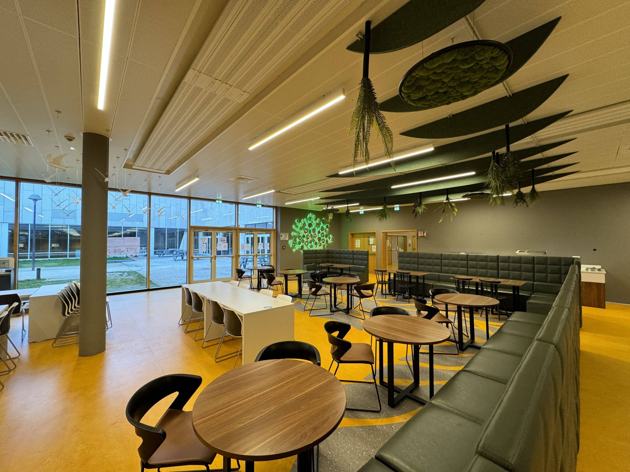 Nous avons déjà réalisé la cafétéria du personnel et la cantine maternelle/primaire. Cet été, nous complèterons avec la cantine collège/lycée. La ligne graphique, inspirée de la nature, vise à créer des espaces calmes et sereins.