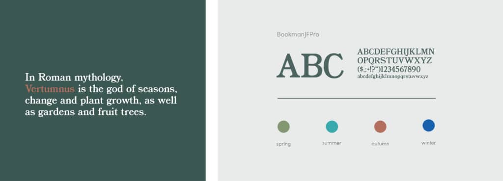 L’identité visuelle de l’étude d’avocats Vertumnus est fondée sur les valeurs de cette société nouvellement créée. En effet le choix du nom de cette étude ne s’est pas fait par hasard puisque Vertumnus est le dieu romain des saisons.