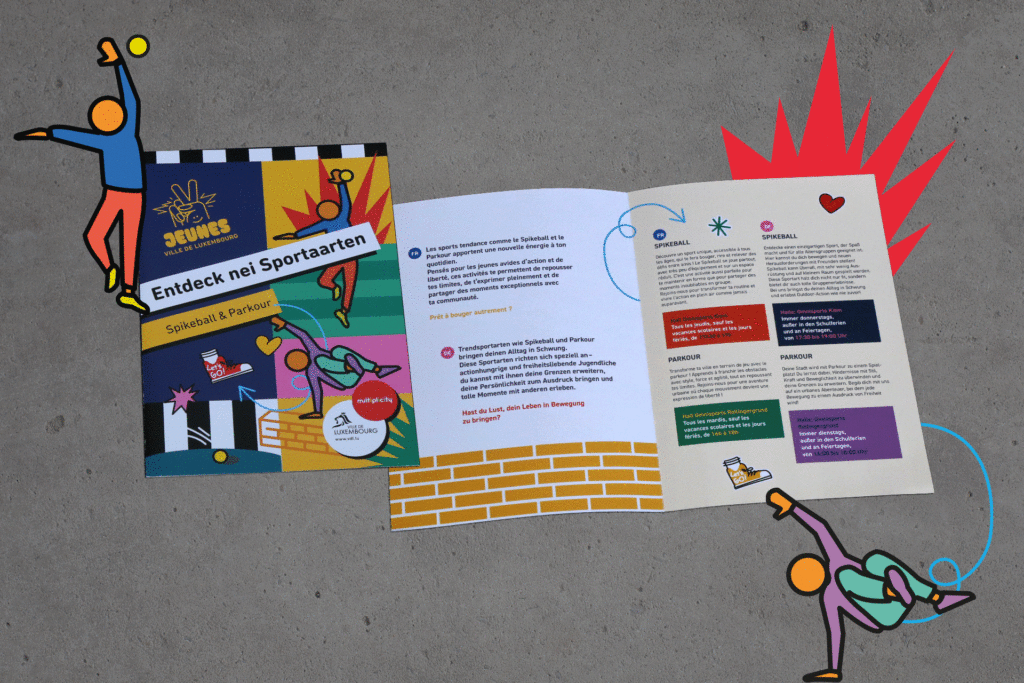 Pour cette nouvelle collaboration, nous avons travaillé aux côtés du Service Jeunesse sur la création d’un flyer visant à faire découvrir aux jeunes de nouveaux sports dynamiques, tels que le Spikeball et le Parkour.
